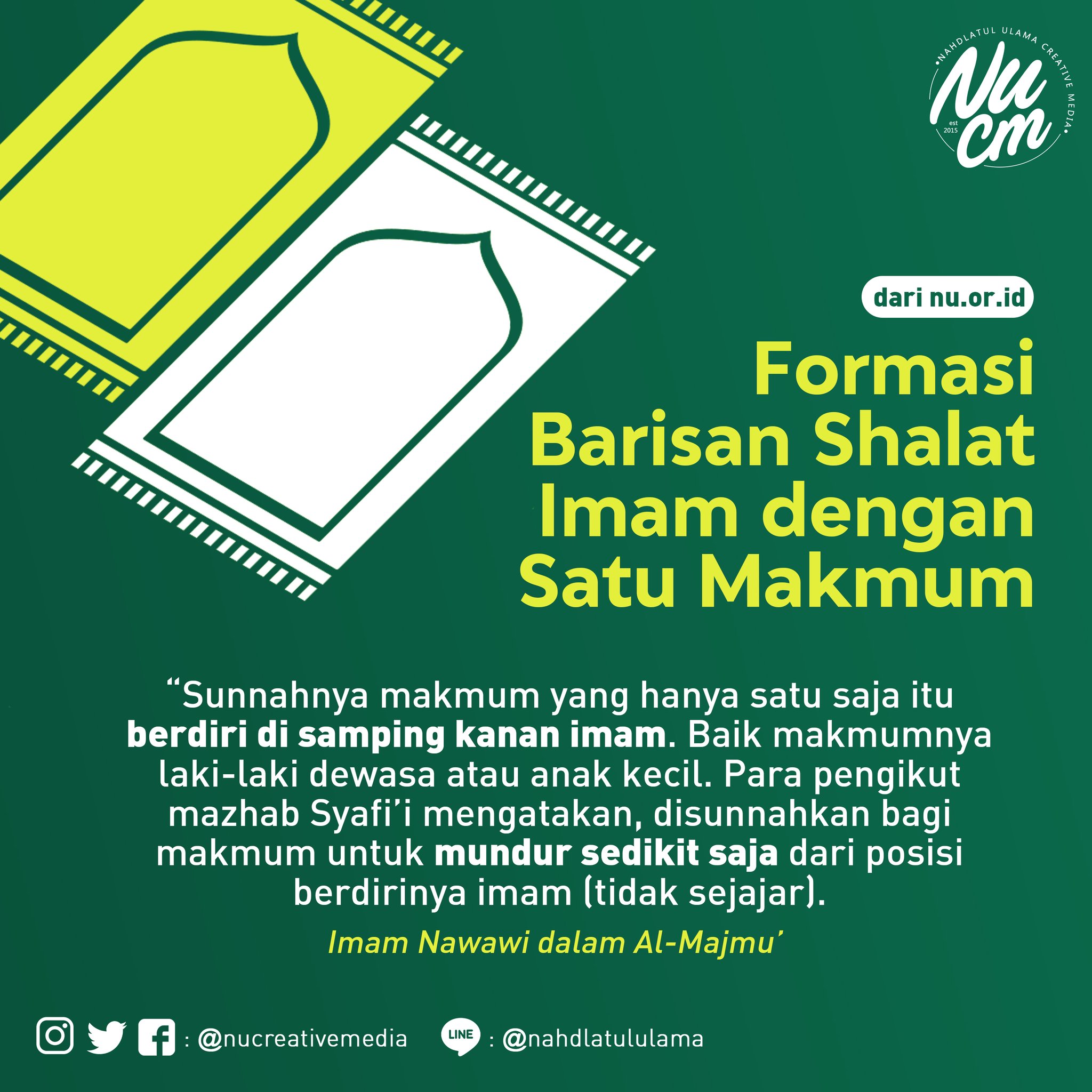 Ketika makmum hanya satu orang maka makmum dianjurkan berdiri di samping kanan imam dengan sedikit mundur sampai jari kakinya berada di belakang tumit imam. Hal ini bisa dilakukan dengan dua cara yaitu makmum. Kemudian setelah makmum kedua takbir keduda makmum tersebut disunnahkan membuat shaf di belakang imam. Pengurus masjid perlu menyediakan pencuci antiseptik tanganhand sanitizer di tempat wudhu toilet pintu masjid. Membersihkan dan menyimpan karpet.